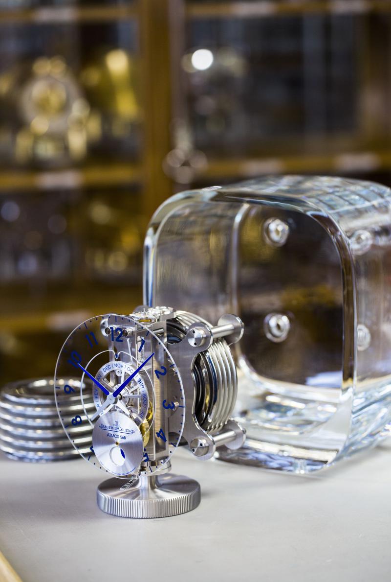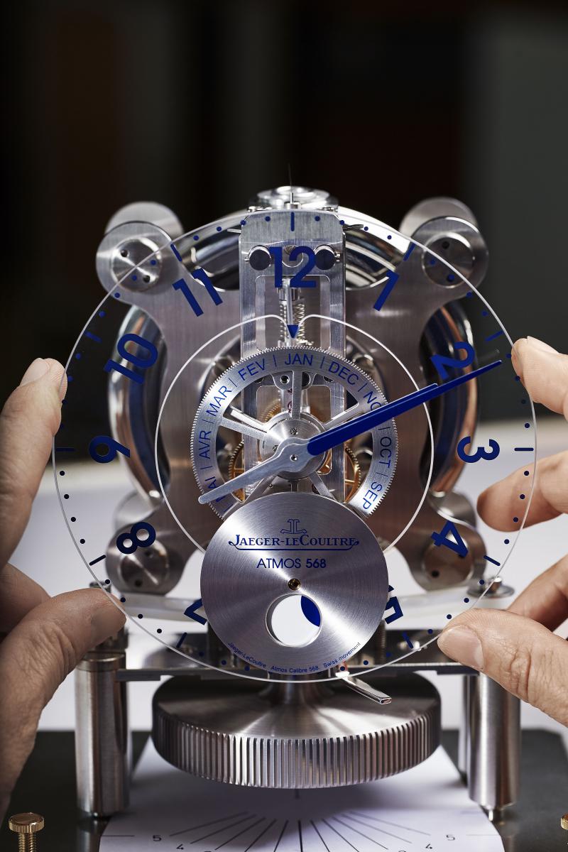 Эти часы хранят в себе множество секретов. Абсолютно прозрачный корпус притягивает взгляд. В боковой части настольных часов Atmos виден лабиринт колесной конструкции, в недрах которой находится герметично закрытая капсула со смесью газов. Расширяясь при повышении температуры и сжимаясь при её понижении, смесь постоянно осуществляет завод часового механизма. Механизм Caliber 568 состоит из 211 деталей. Кроме часовой и минутной стрелки, часы имеют индикатор месяца и фаз Луны. Счетчики, стрелки, часовые индексы на диске циферблата выполнены в синем цвете.