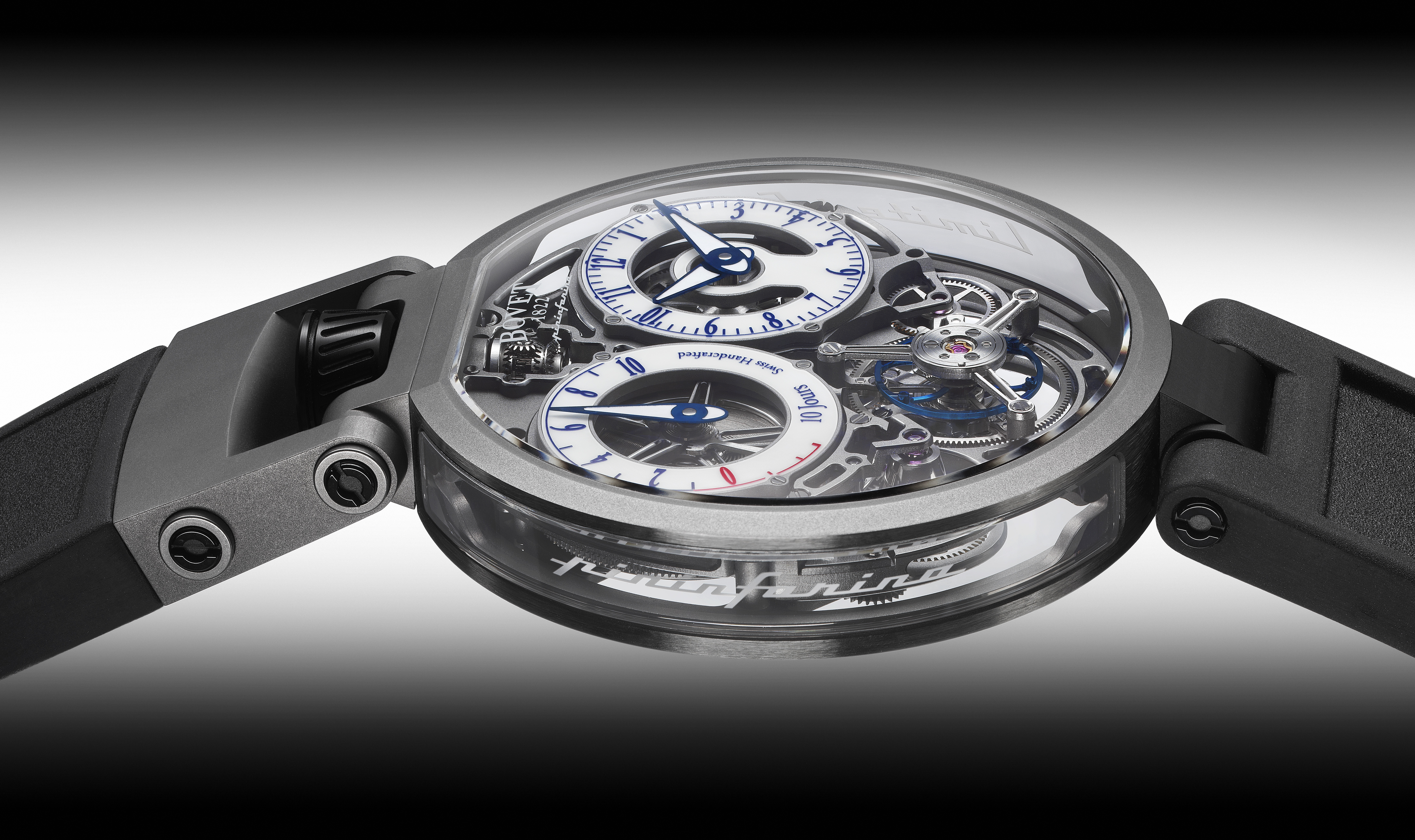 Все дело в совершенстве. Давайте посмотрим на Bovet OTTANTASEI by Pininfarina 10 Days Power Reserve Flying Tourbillon. Это ультратонкая модель отличается своей полной прозрачностью. За ходом этих часов можно наблюдать как с лицевой, так и с обратной стороны. Вес титанового корпуса составляет всего 21 грамм. Это еще и сверх-легкие часы. Скажу честно, это настоящее удовольствие для коллекционеров – смотреть, изучать, наслаждаться ходом этой модели. Архитектура механизма – это нечто невероятное, созданное командой Pininfarina. Особенно хорошо механизм просматривается, если поднести его к свету.