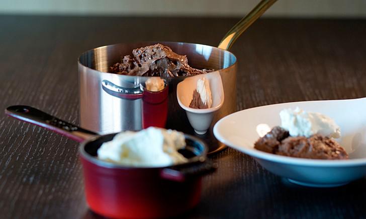 Когда дело доходит до десертов, многие, как правило останавливаются и стараются выбрать что-то легкое, типа тарелки с фруктами. Но, как можно устоять перед здешним фирменным шоколадным муссом, который выносят в зал прямо в медном сотейнике, а из второй такой же посудины добавляют к нему взбитые в белоснежные облака сливки… Это уже не десерт, это просто шоу какое-то, в исполнении превосходного дуэта из главного кондитера и менеджера ресторан La Môme, наперебой предлагающих всё-таки попробовать мусс. Конечно, перечень десертов в меню этим не ограничивается, здесь есть и сыры, и миндальные пирожные и много чего еще, но хорошего, как говорится, понемногу….